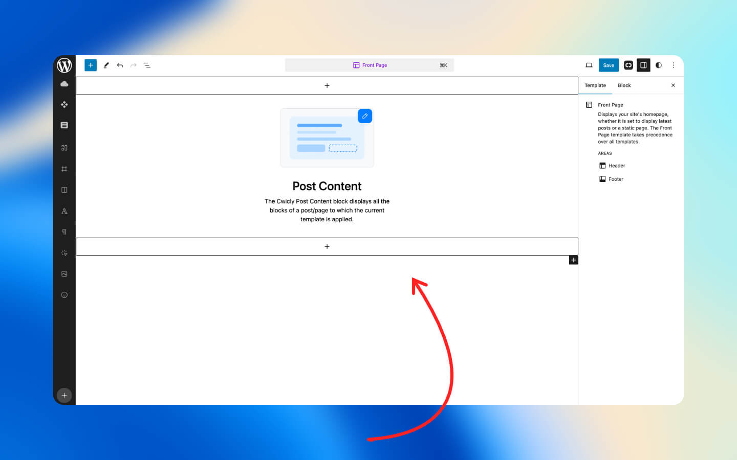 * The Front Page now displays the Post Content block you have added.