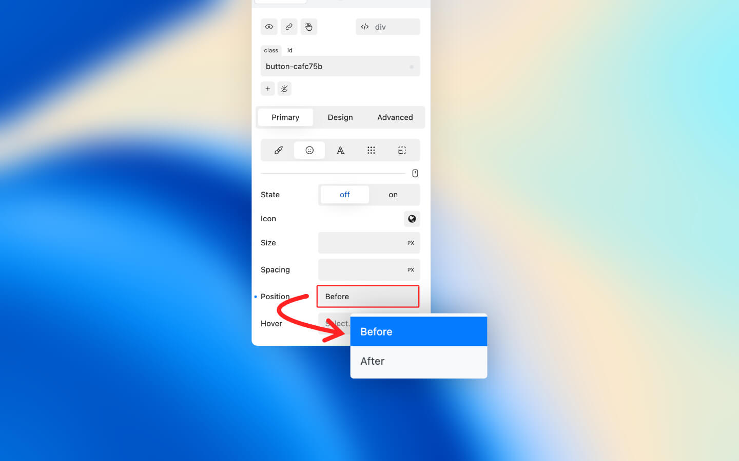 The Icon Position property allows you to define whether the icon should be placed before (to the left) or after (to the right).