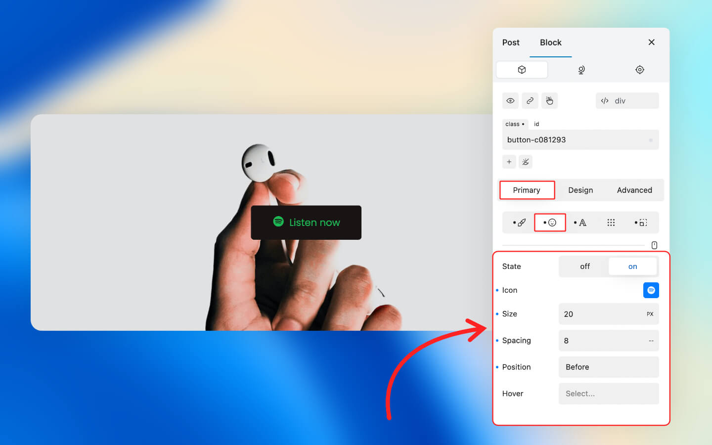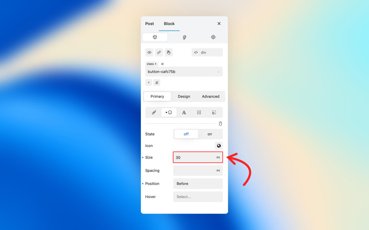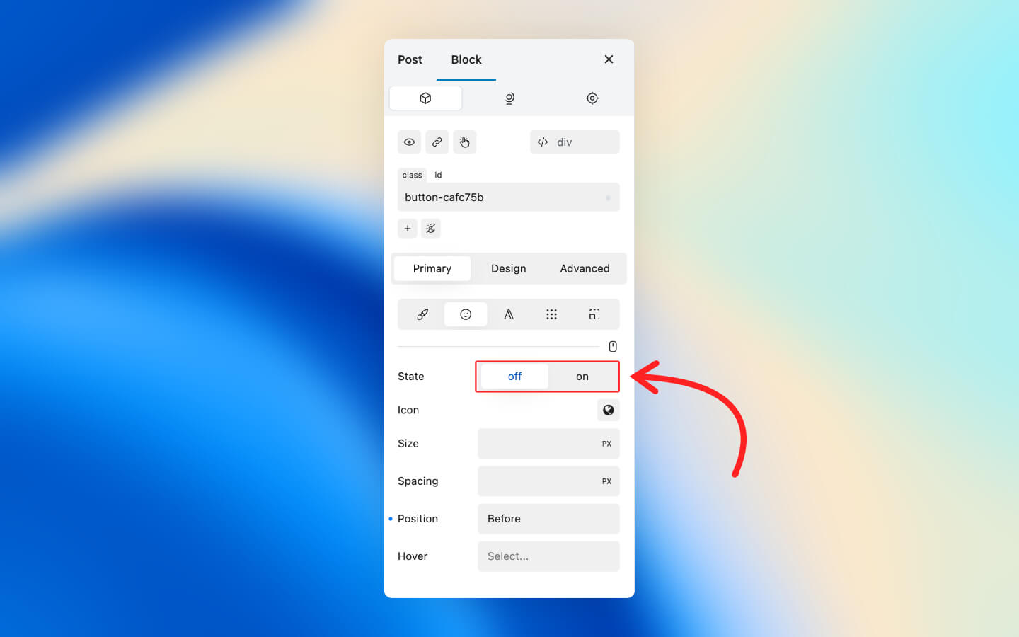 * In the Primary tab of the Block Inspector, open the Icon tab.