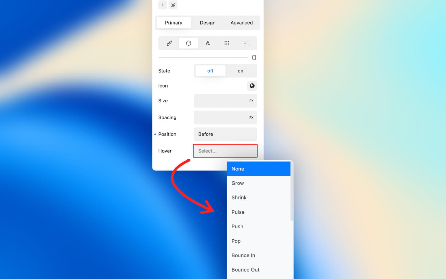 The hover property allows you to add a hover effect to your button. Possible effects include: none, grow, shrink, pulse, push, pop, bounce in, bounce out, rotate, zoom rotate, rise, set, levitate, de-levitate, skew, wiggle vertical, wiggle horizontal, shake out.