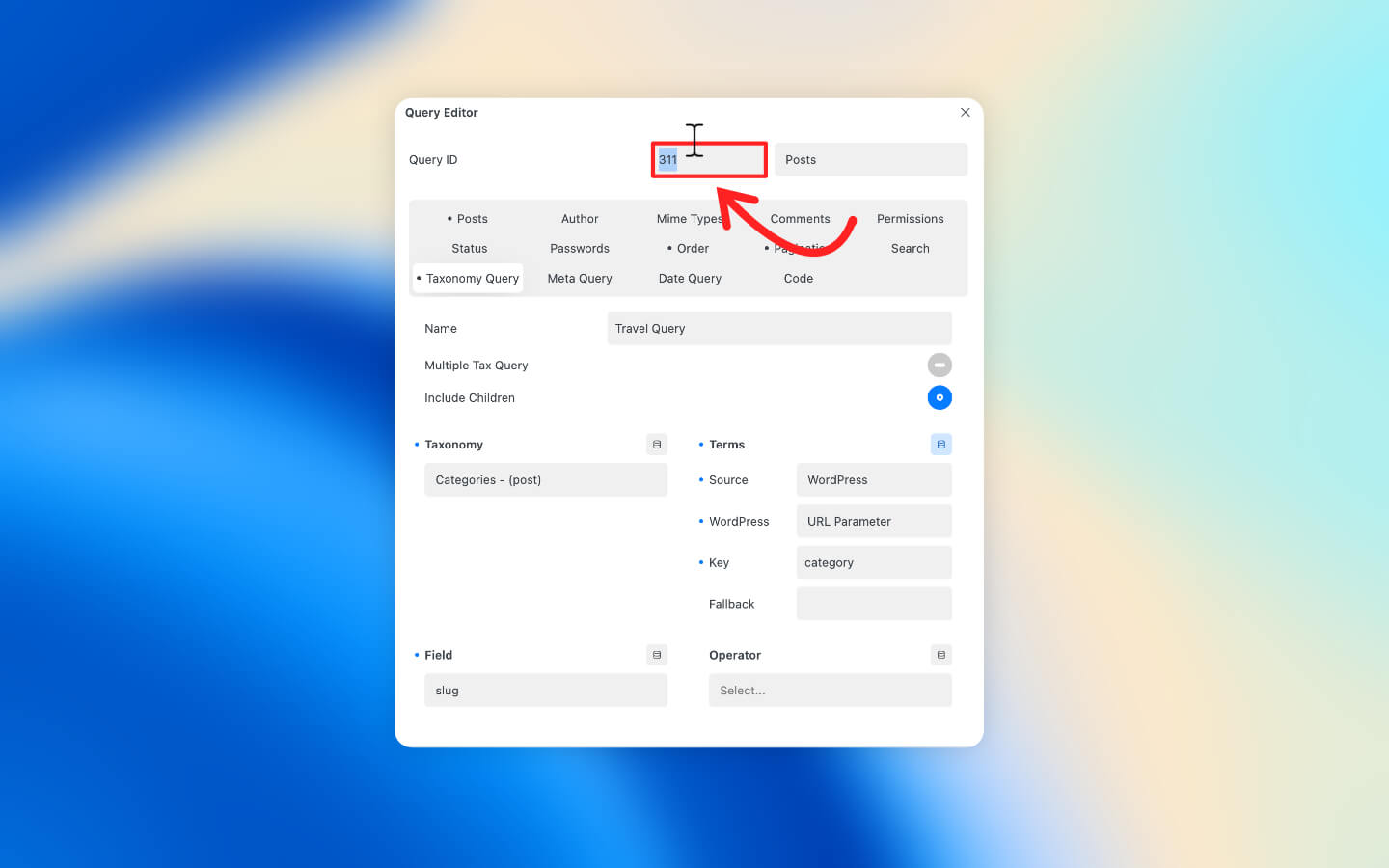 * In the Query Editor modal, input the ID of the Query to which you wish to attach the filter.