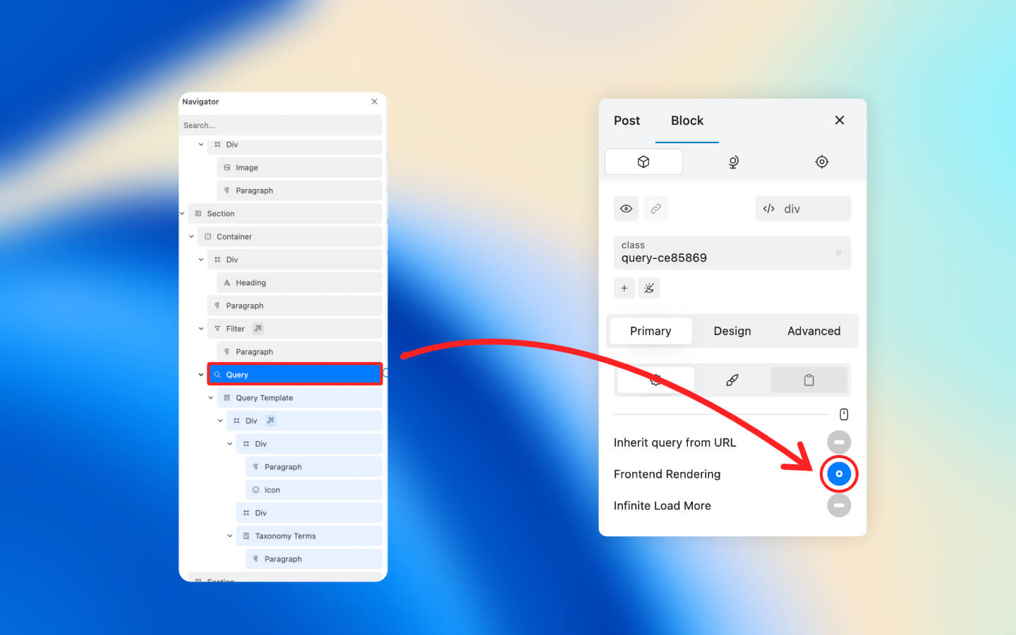 * In the Primary Tab of the Block Inspector, open the Query Editor.