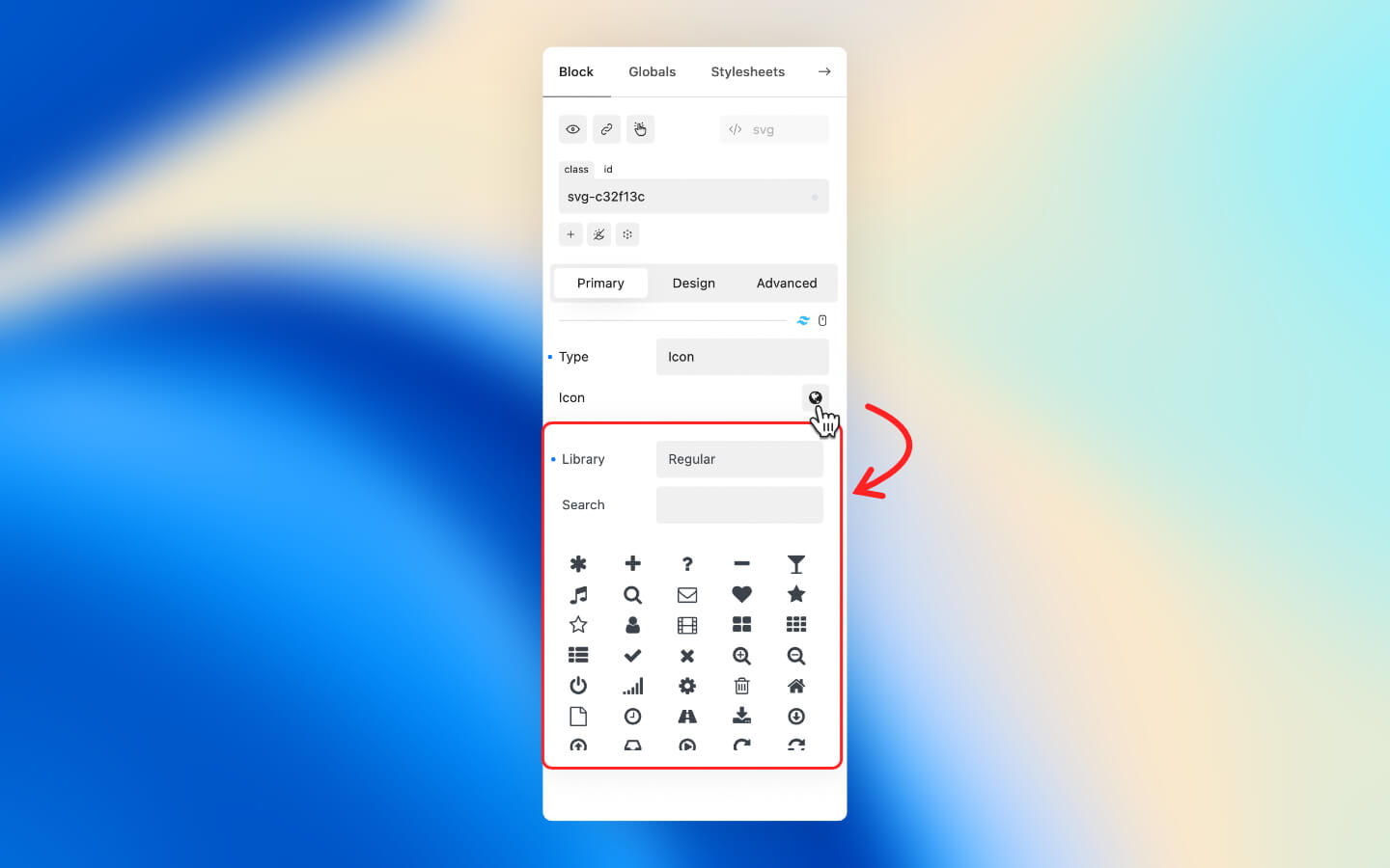 * Click "Icon" to open the Icon library or search for required icon.