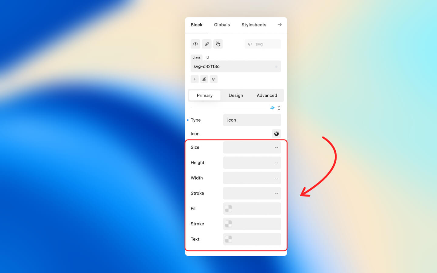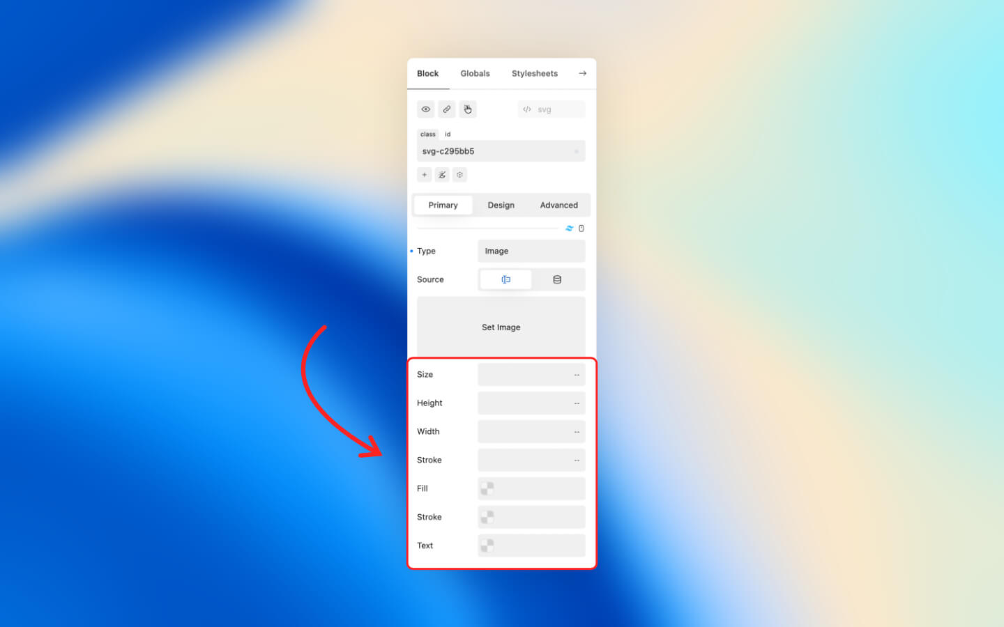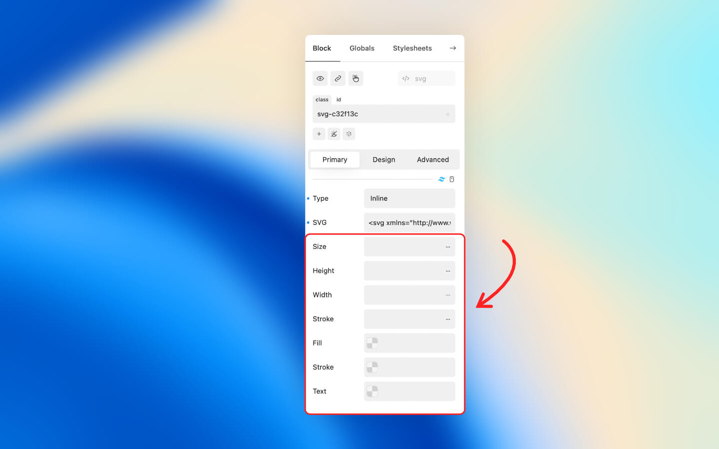 The SVG property allows you to paste an SVG code snippet.
