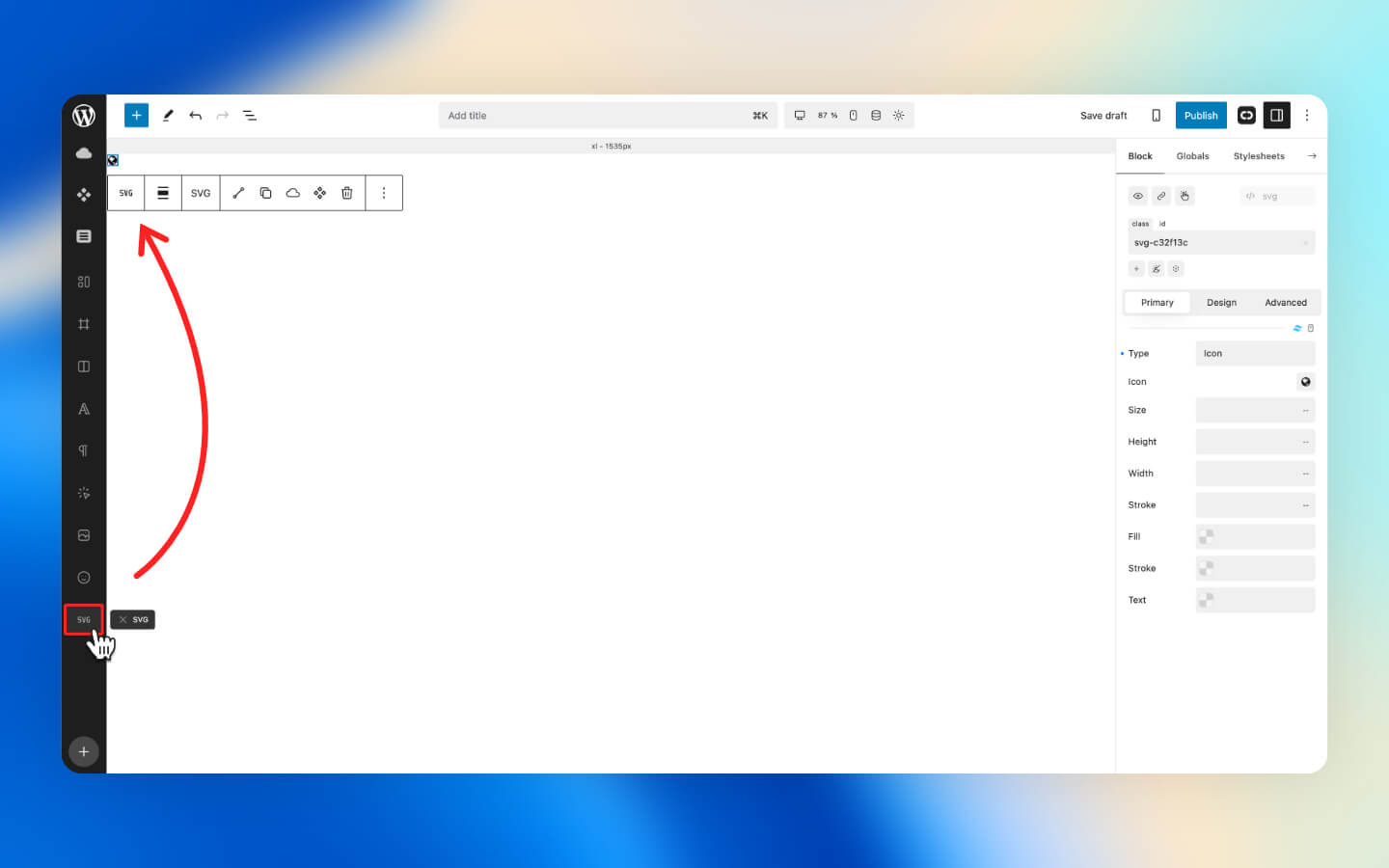 The SVG block allows you to add icons,  SVG images and inline SVG code snippets in an instant.