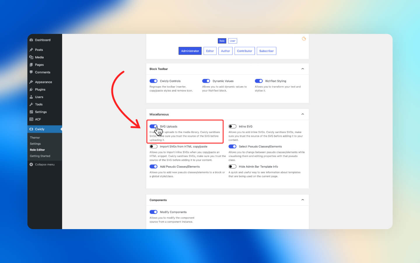 The SVG Uploads property enables you to upload SVG images to the media library.&#x20;