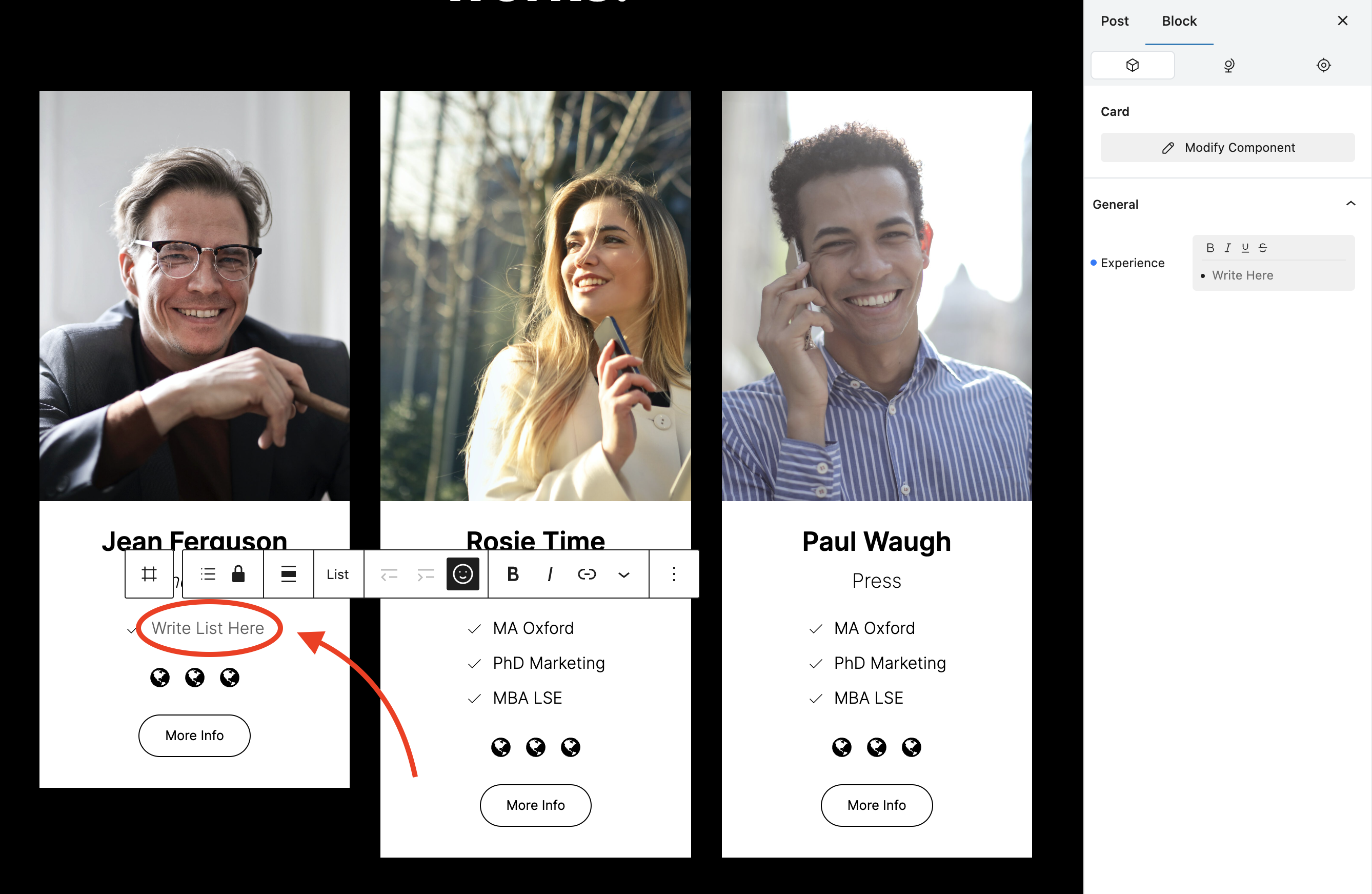* The List Property name is now visible in the Content field in the Block Inspector.