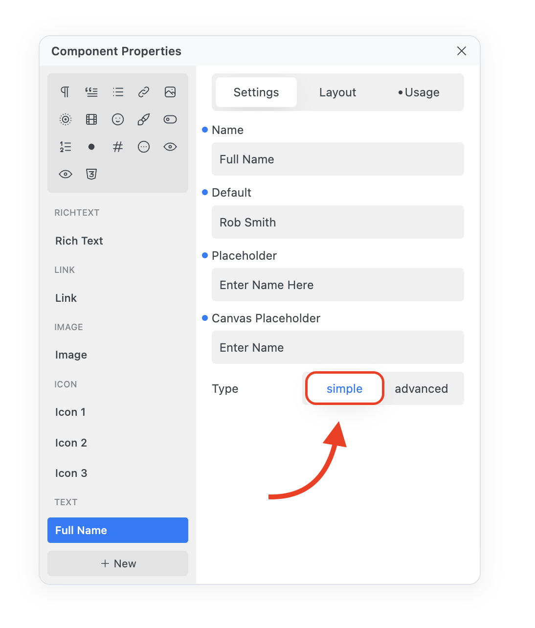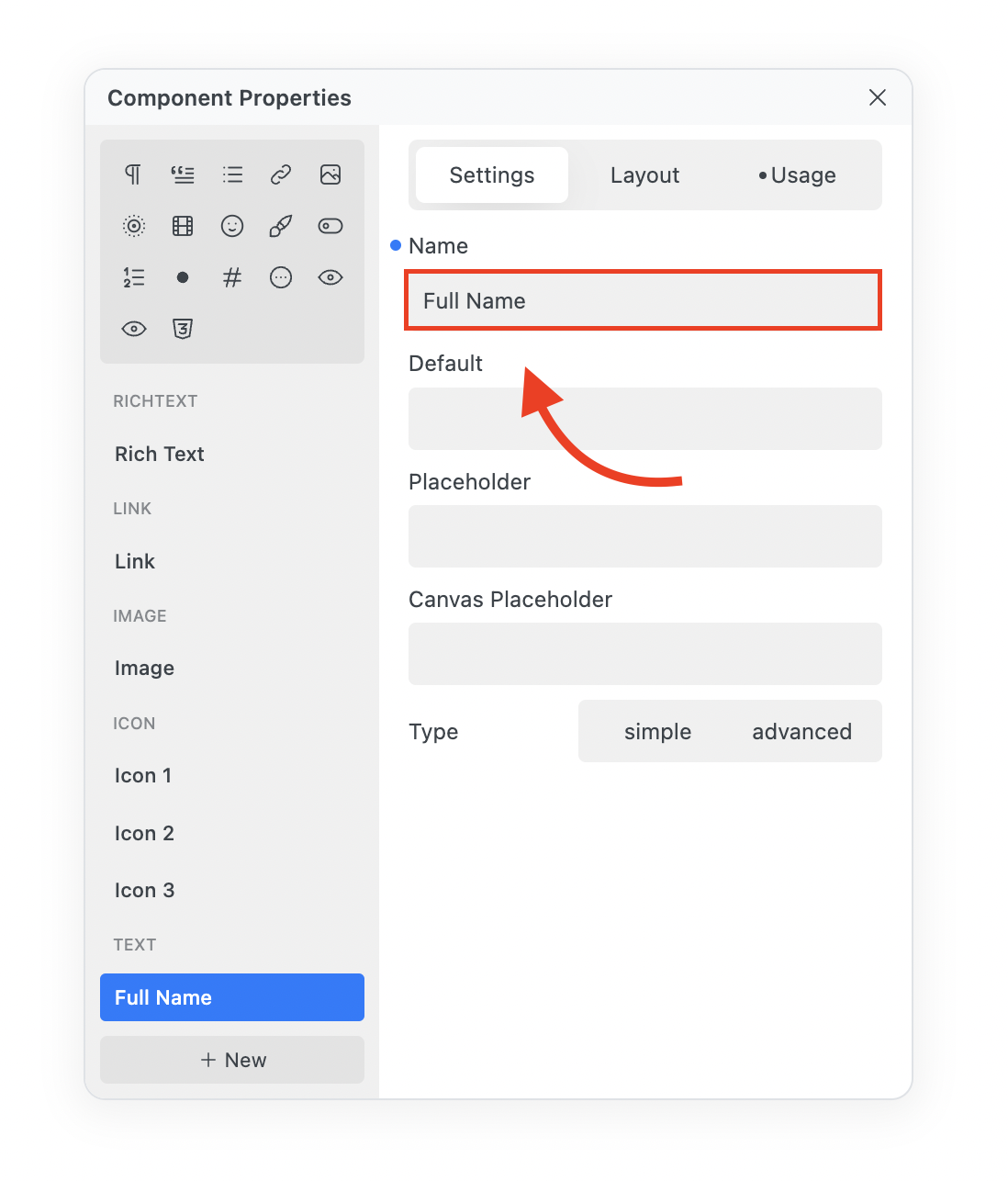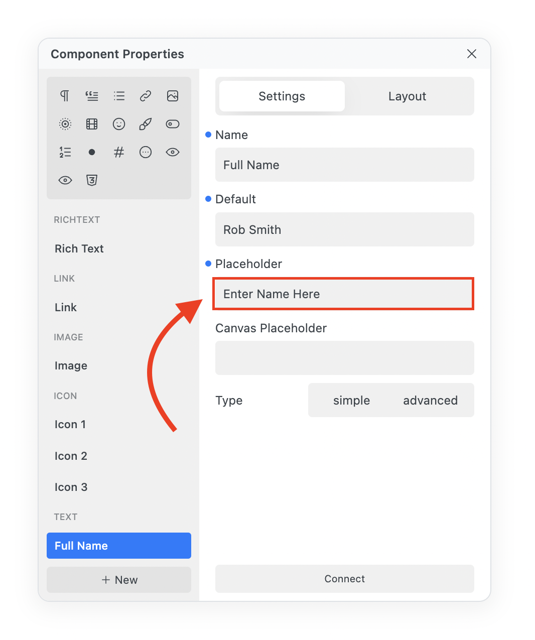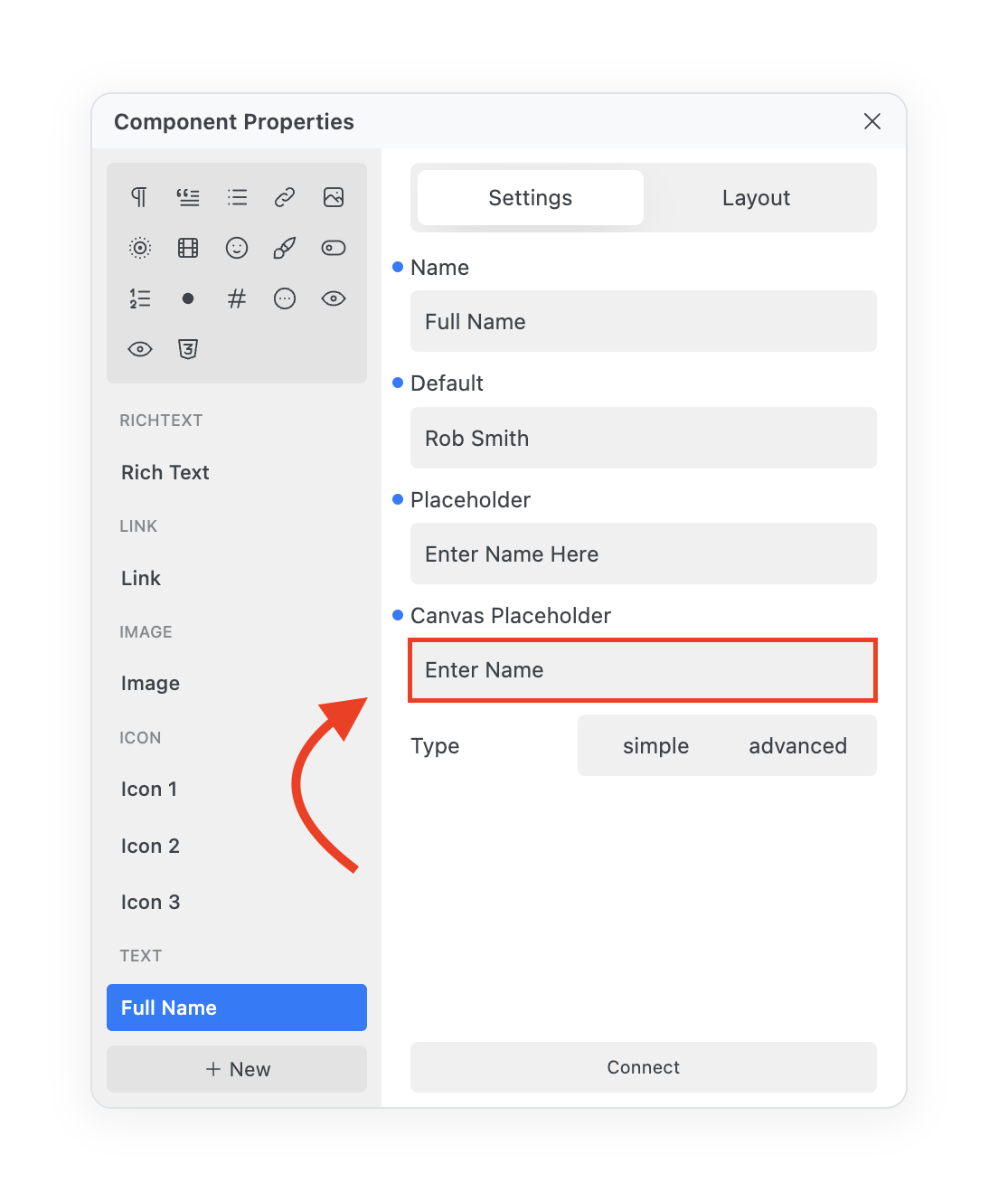 The Text Property allows you to add a Name, Default, Placeholder, Canvas Placeholder and Type (Static or Advanced) to your Component.&#x20;