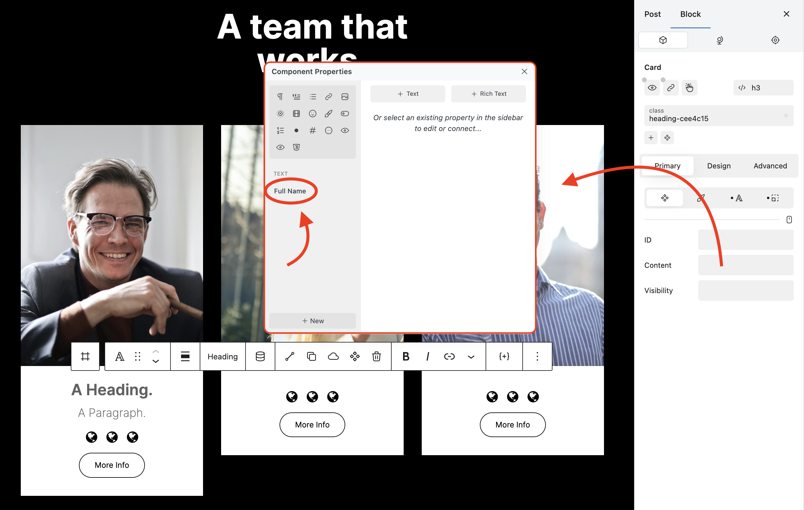 * Open the Components Properties modal by clicking the "+" icon in the Block Inspector.