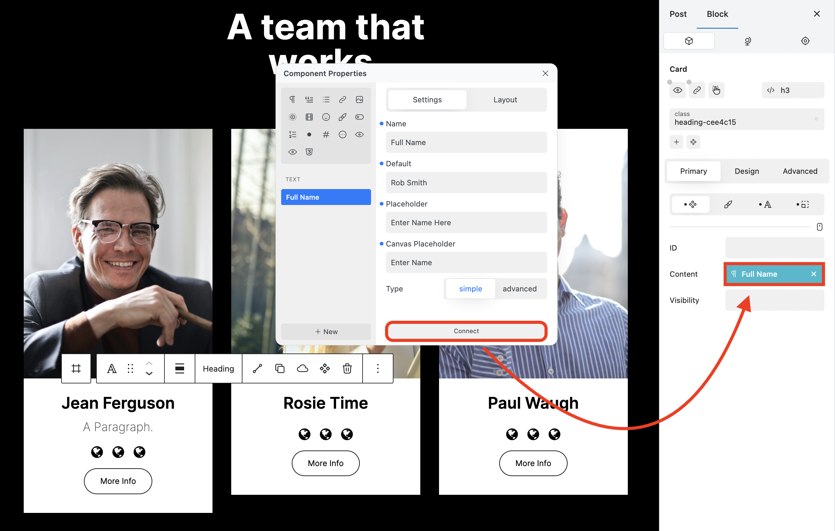 * Select the Component to which you want to connect the Text Property.