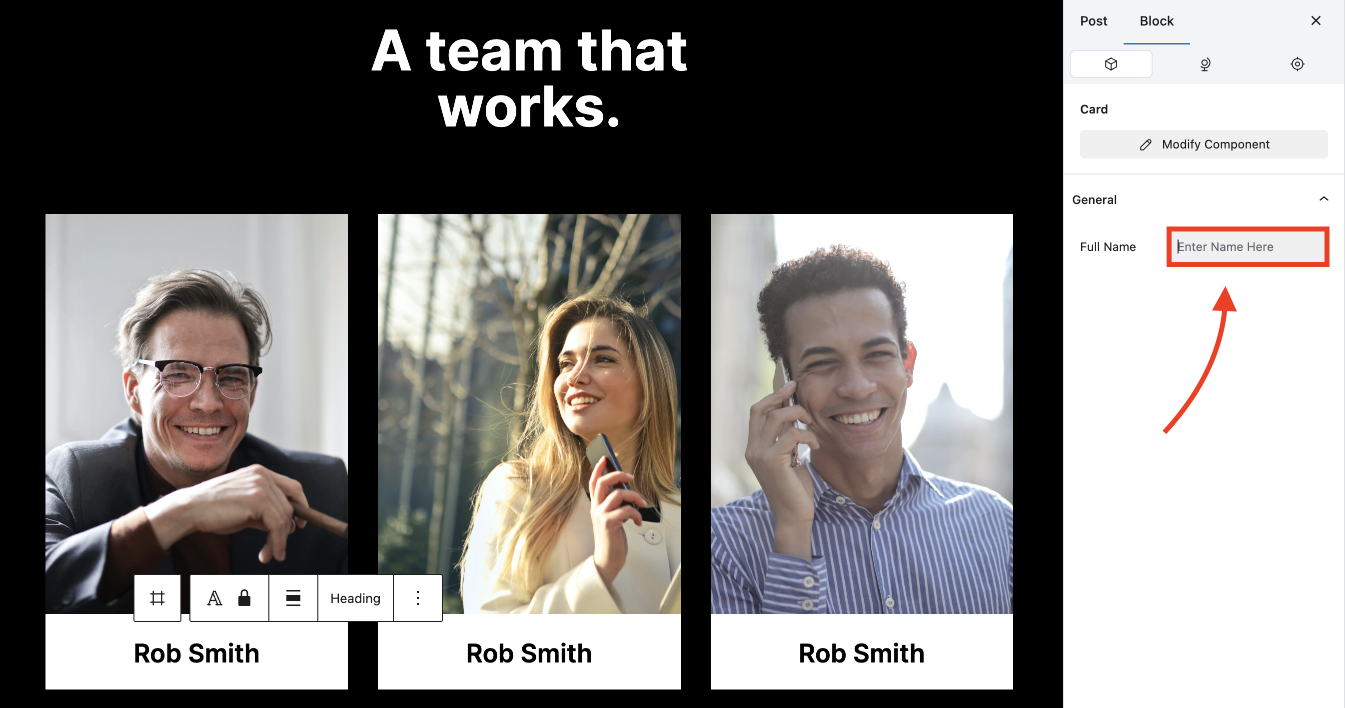 Canvas Placeholder text will now be visible in the Text field of the Page or Post, such as Enter Name.