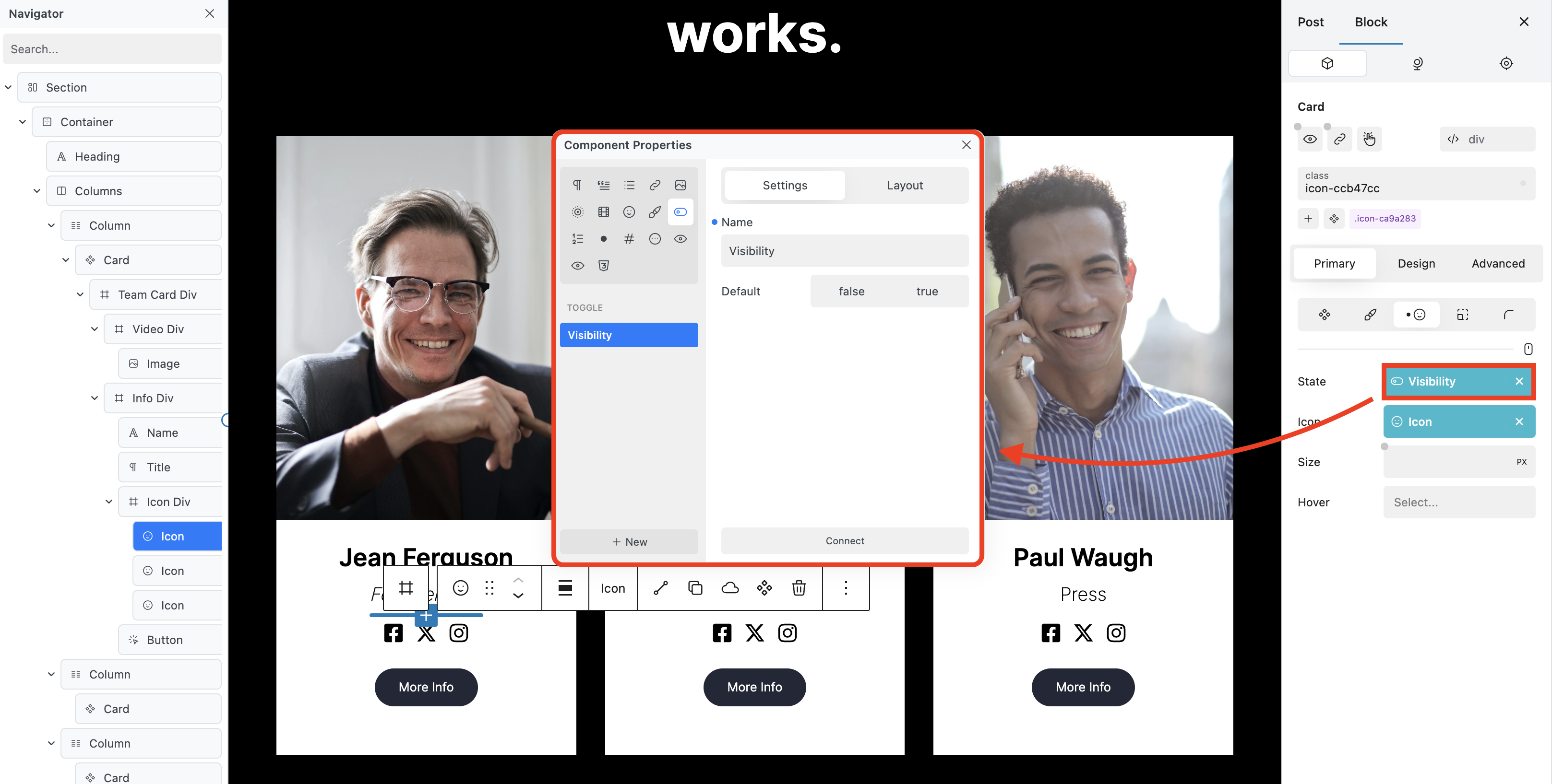 * In the Block Inspector, click Component icon above the Property you wish to modify to open the Component Properties modal.