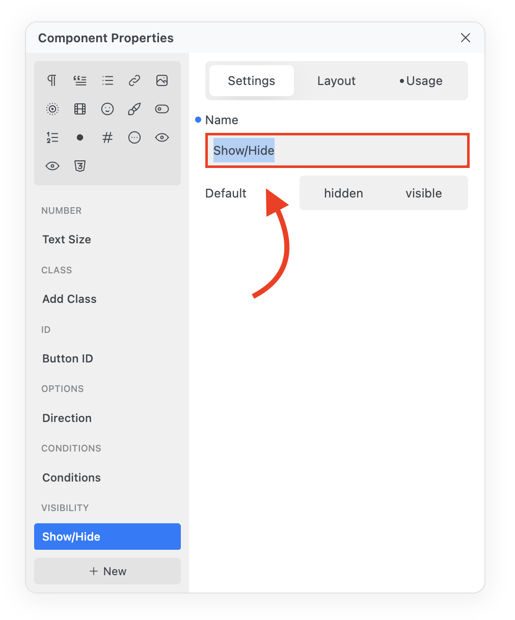 * Select the Component to which you want to connect the Visibility Property.