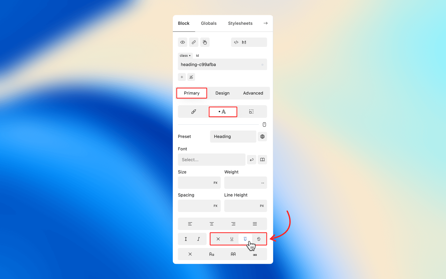 If a Font Decoration has been applied in a parent block, it will be inherited unless otherwise specified on the selected block.
